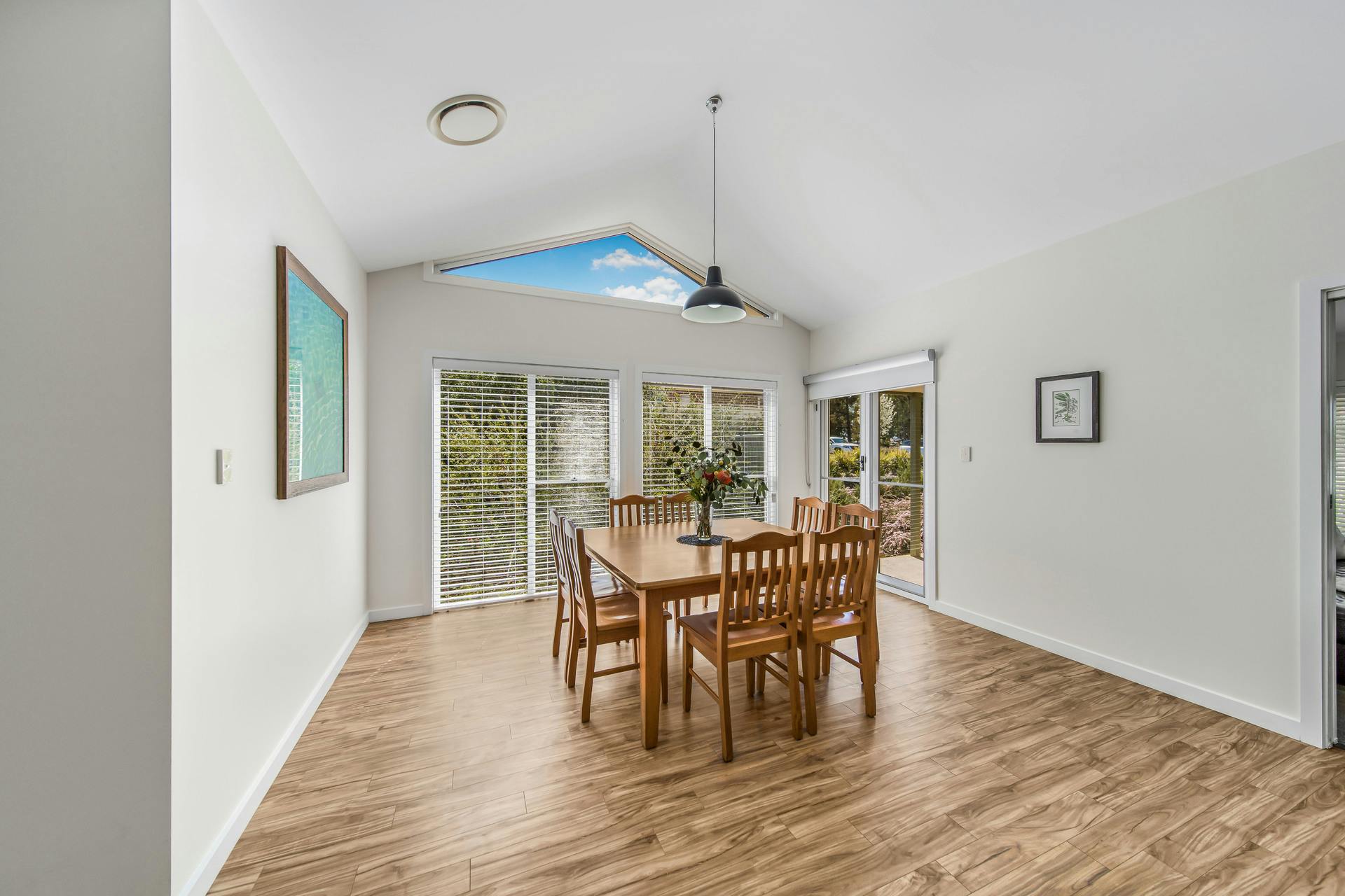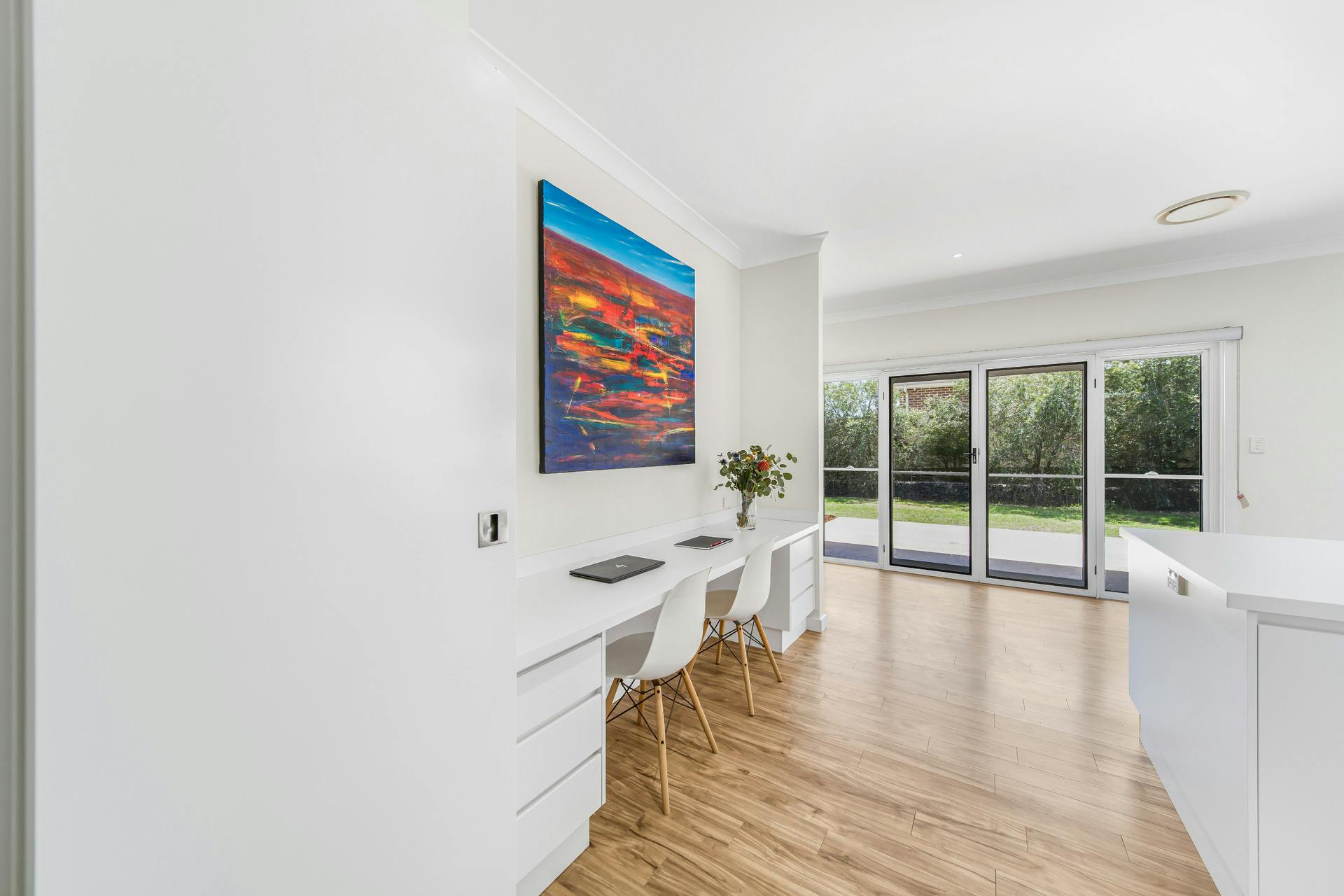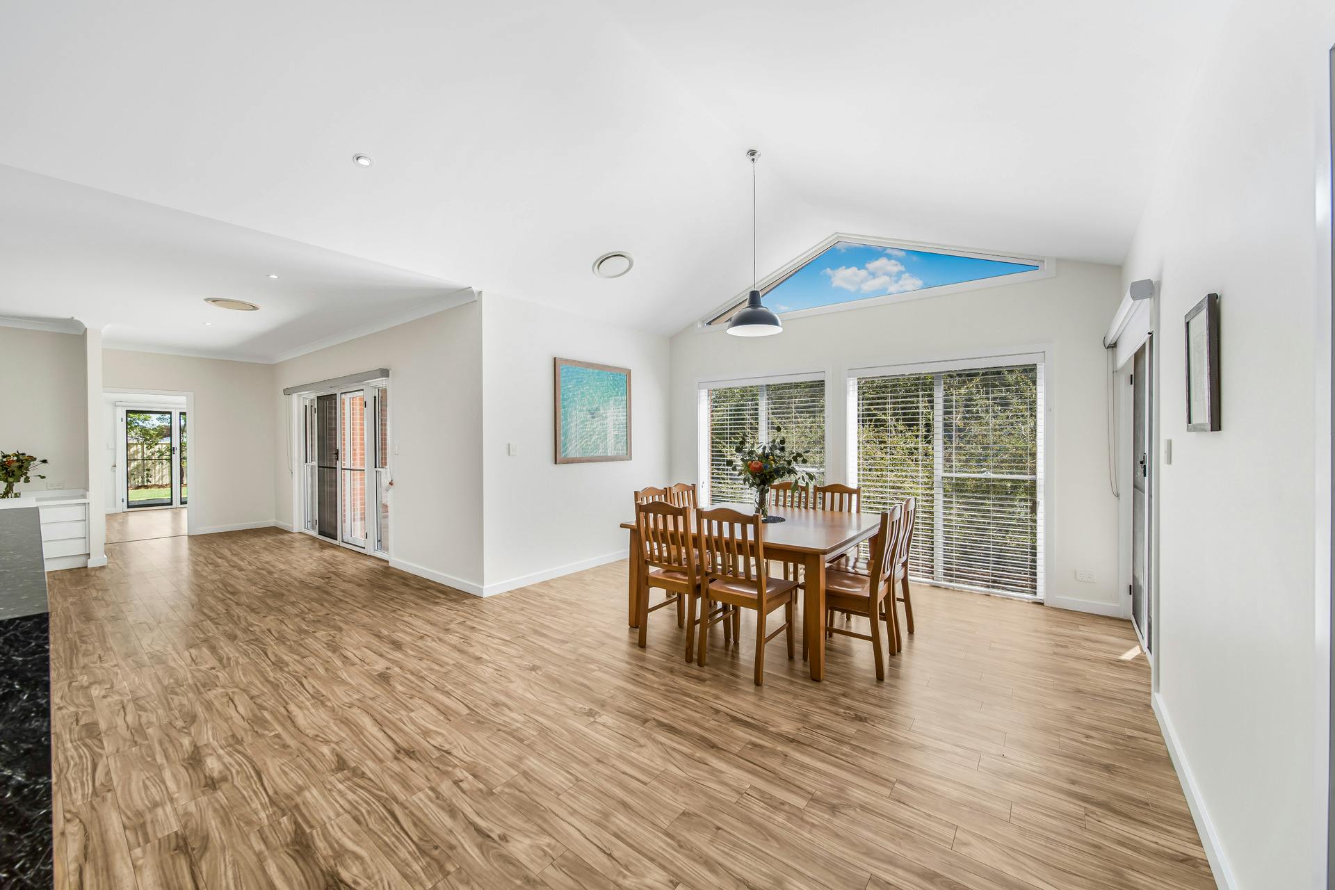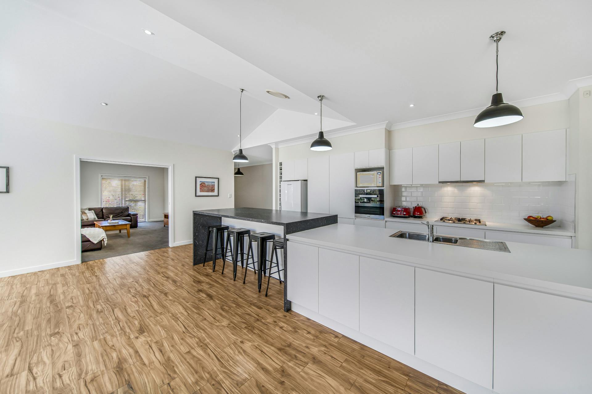 - Light-filled kitchen with raked ceilings, breakfast bar, abundant storage, gas cooktop and study nook